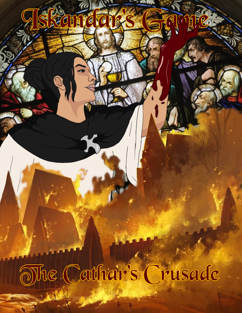 A slightly darker cover proof featuring the novel’s antagonist, Perfect Natalia (That is actually what the Cathars called their priests) and was made primarily with an eraser.