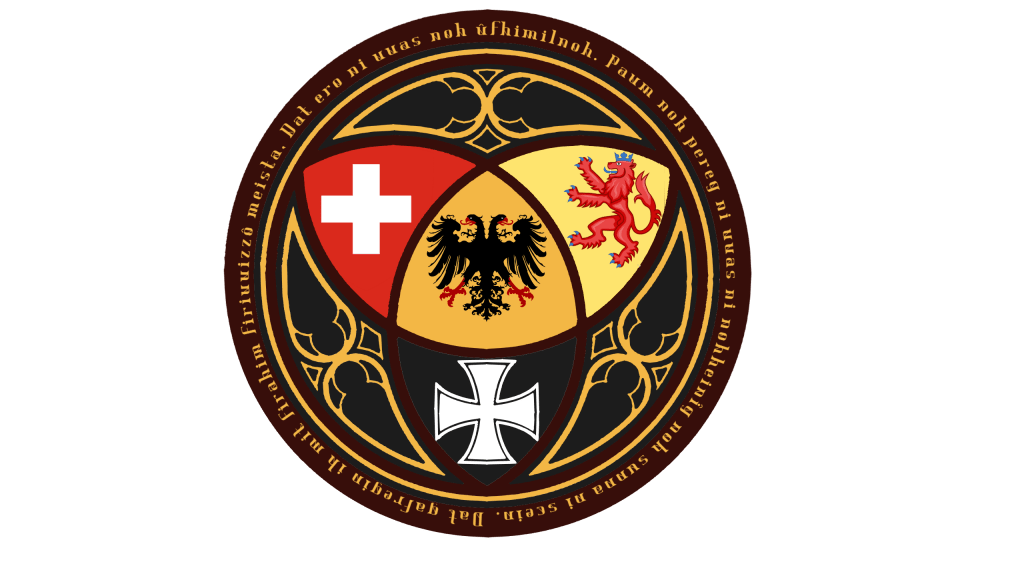 The seal used by the Palatine Order of Cologne, who lords over Germany, Austria, and Switzerland as shown in the Swiss cross, Teutonic cross, and Habsburg lion surrounding the Imperial Eagle. They claim descent from Charlemagne’s Paladins and are heavily associated with High Medieval Christian mysticism. The words around the border of the gothic window pattern are a German prayer, although I honestly forgot which one.