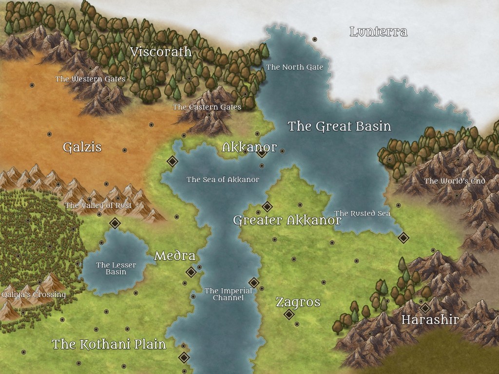 The world of Akkanor is incredibly small compared to most planets. This is because Akkanor isn’t a planet, but one piece of thousands that used to belong to the same gigantic planet. The world’s borders are demarcated by an extra-dimension wall around the edges of this map called Schisms. While Akkanor is meant to be united under one imperial banner, such that they can stand united against their otherworldly enemies, the recent decades have seen the human-minority regions secede from the Empire and spark a civil war, led by the Kothani.